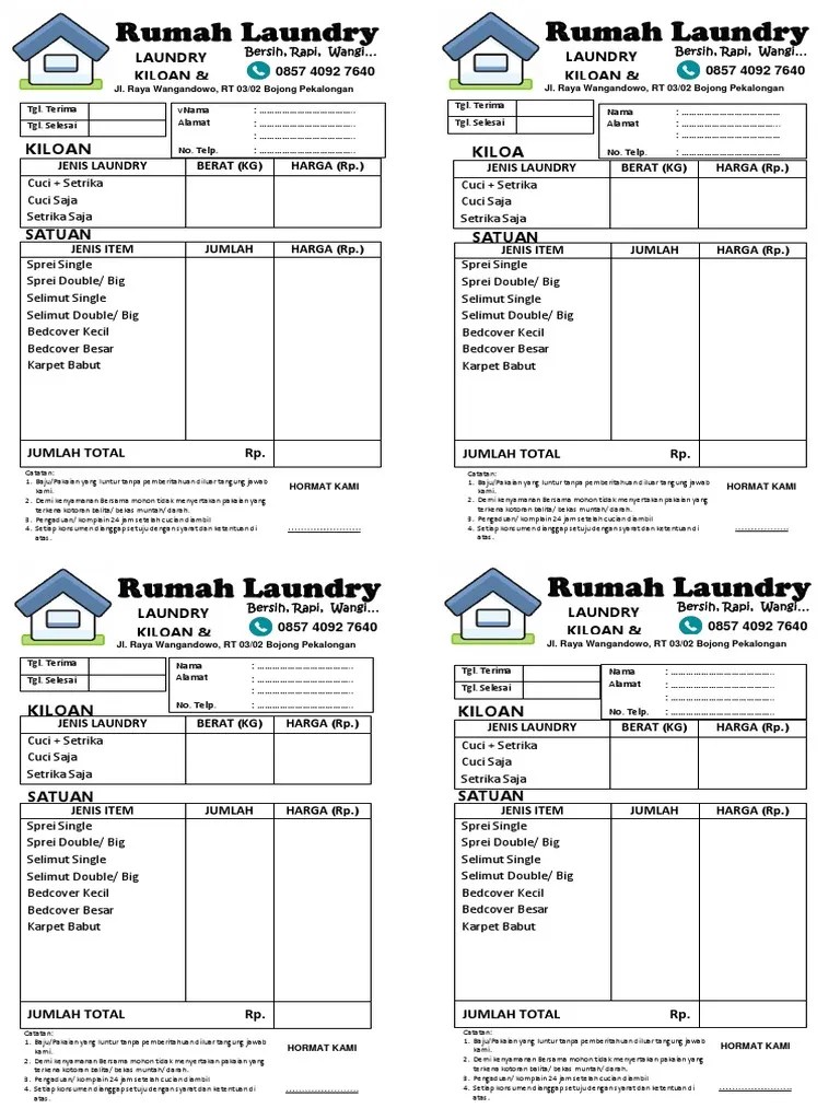 Cetak nota rangkap 2 ply kwitansi laundry kiloan loundry satuan ncr. Pembayaran dilakukan setelah nota digital dikirimkan via whatsapp sebelum. Raya wangandowo, rt 03/02 bojong pekalongan satuan tgl. Bersih, rapi, wangi…laundry 0857 4092 7640 kiloan & jl. Daftar harga nota laundry nota terbaru oktober 2021. Di video kali ini kami mau membahas tentang : Di video kali ini kami mau membahas tentang : Apabila terdapat pakaian yang hilang untuk layanan kiloan dan satuan, . Kerjasama droppoint laundry kiloan dan satuan sawangan dan sekitarnya kaskus from . Nota kontan custom untuk laundry toko klontong bengkel apotek dll. Beli nota laundry terlengkap harga murah october 2021 di tokopedia! Pembeli meminta rasa green tea, ternyata kami kirimkan choco royal. Melayani cuci satuan, kiloan, dry clean, cleaning sepatu, tas, .